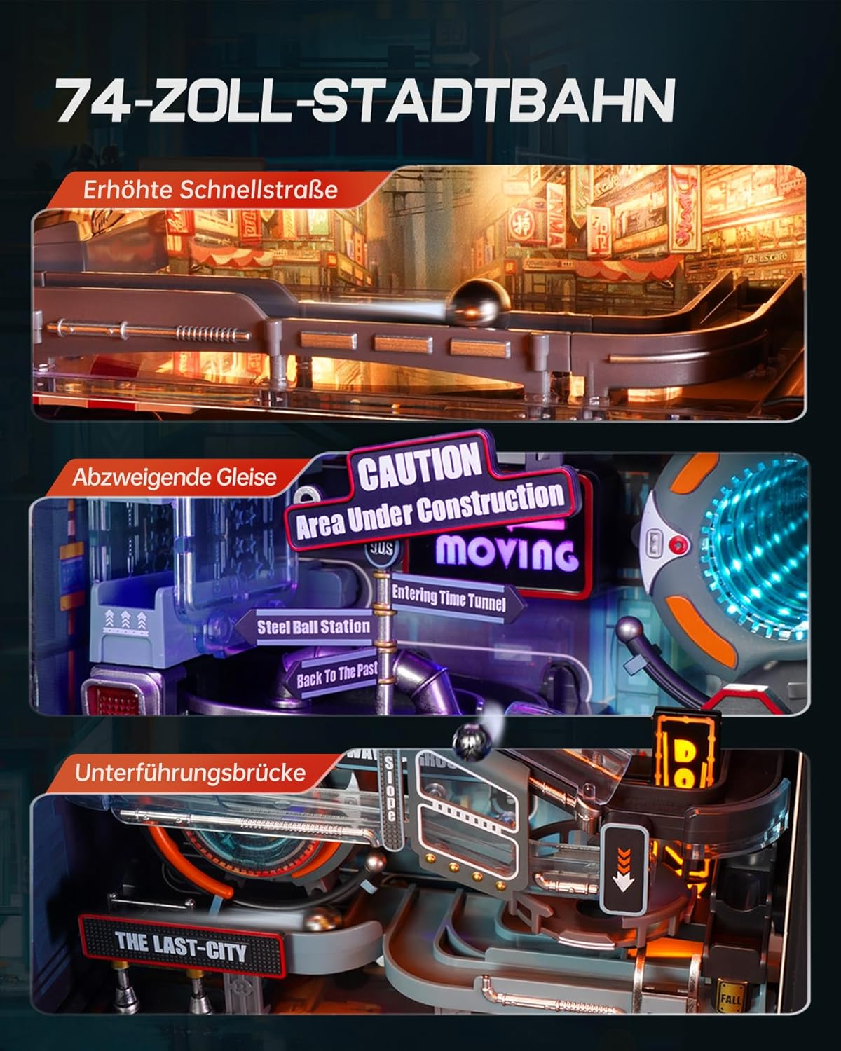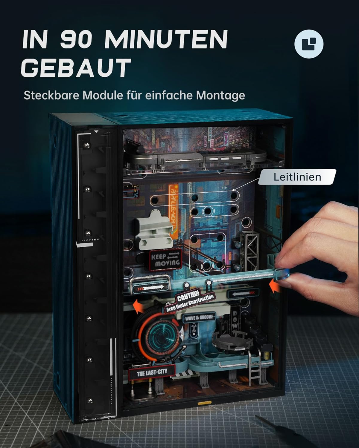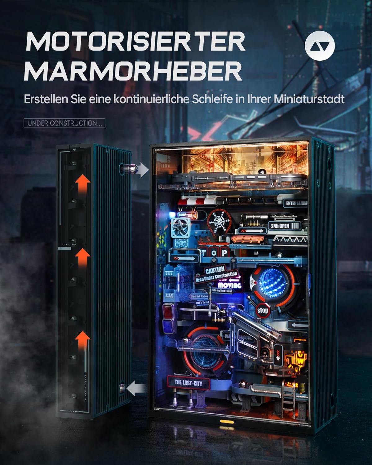 Ein von Cyberpunk inspirierter Miniaturmodellbausatz zum Selberbauen mit vollautomatischem Kugelaufzug. Anschluss über USB-C, Start per Fingertipp und zwei Modi: Kugellauf oder Lichtshow.