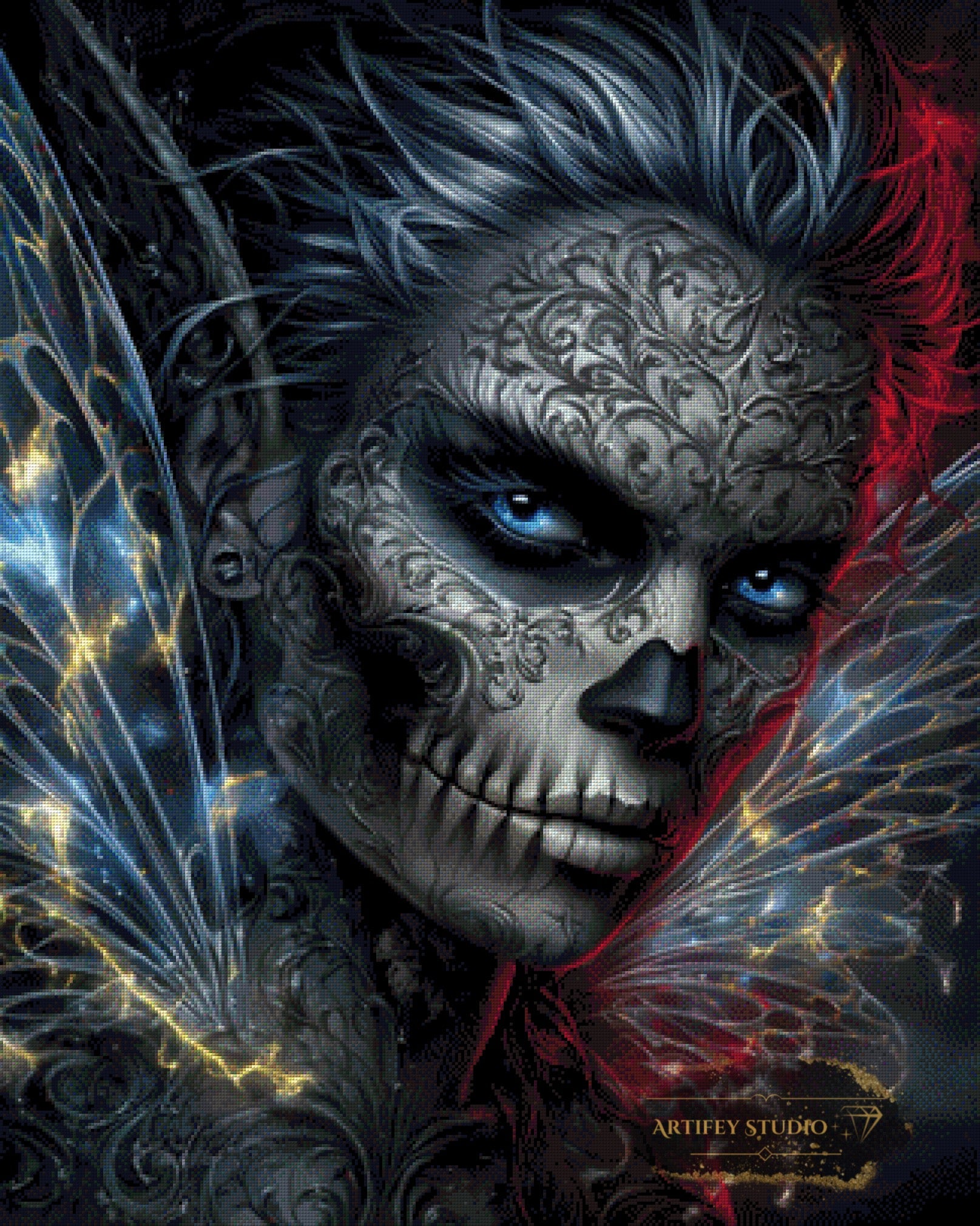 Mit diesem Diamond Painting Set gestaltest du ein detailreiches Kunstwerk in brillanten Farben. Das gezeigte Bild zeigt bereits die fertige, gepixelte Vorlage – so weißt du genau, wie dein Motiv später wirkt.